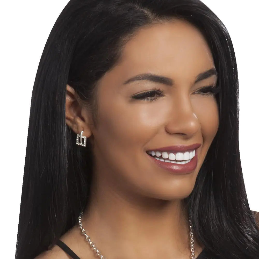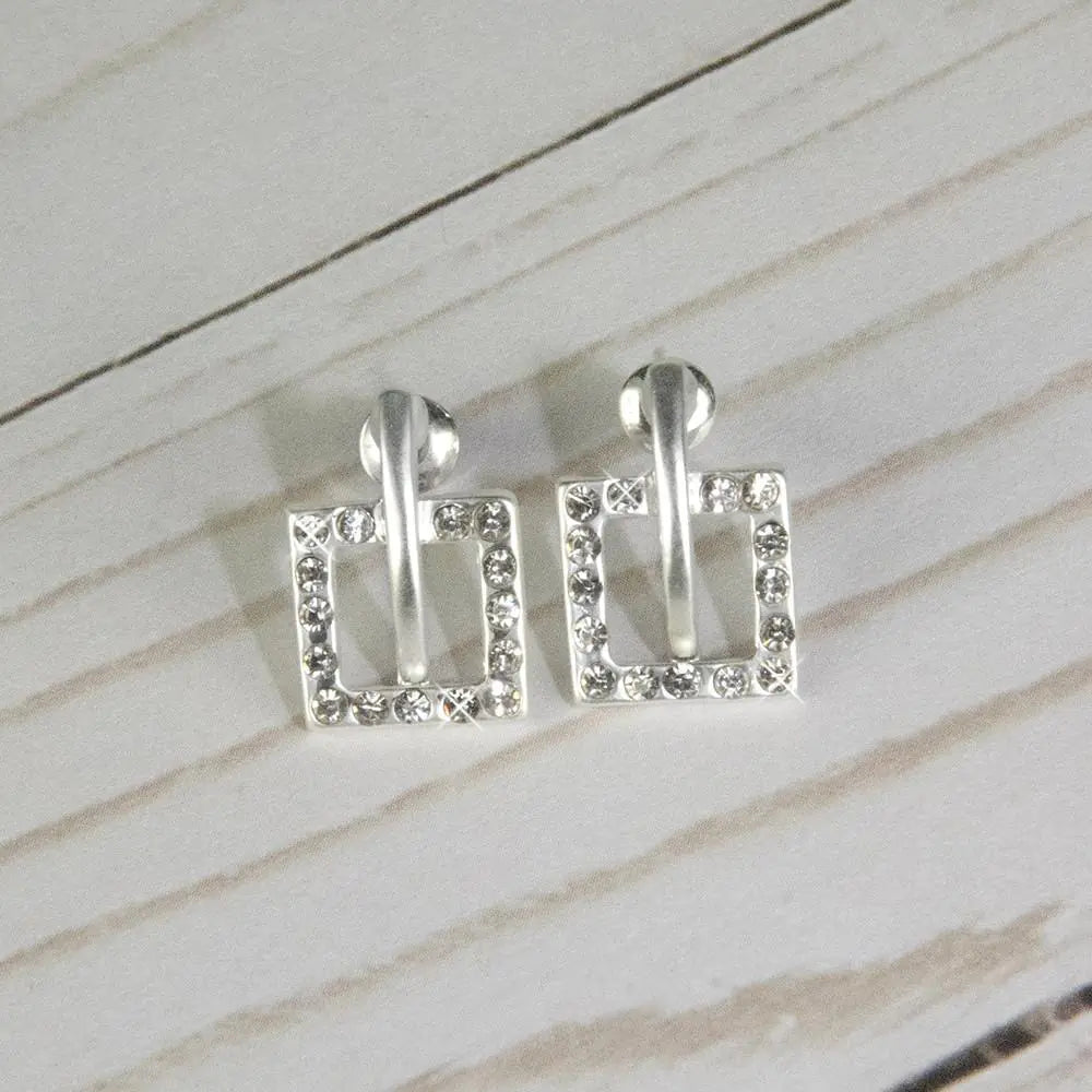 Sparkling, pave-set cubic-zirconia stones add a subtle touch of glam to the delicate squares. Brushed silver finish. Also available in or gold tones.